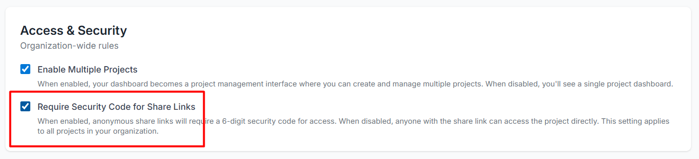 • Behavior when Enabled: Both anonymous share links and direct email invitations will require a 6-digit security code for access. Users cannot view project content without entering this code.